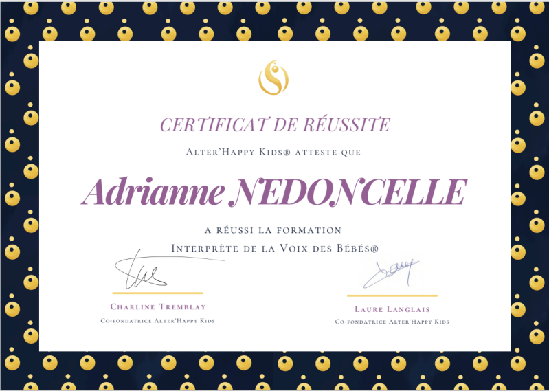 Je suis Adrianne, thérapeute pour enfants, certifiée Interprète de la voix des bébés, formée par l'école de thérapies alternatives Alter'Happy Kids.